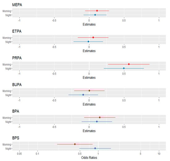 In the case of parabens, a statistically significant positive association was only found for PRPA and time (morning) (β = 0.57, 95% CI: 0.27, 0.86, q < 0.001) as well as time (night) (β = 0.50, 95% CI: 0.21, 0.86, q = 0.006). For the rest of the parabens, including bisphenols, there were no statistically significant associations between the urinary concentration levels of MEPA, ETPA, BUPA, and BPA and time of urination groups of the day; BPS was significantly associated with time (morning) (β = 0.41, 95% CI: 0.21, 0.81, q = 0.047) but not with time (night) (Figure 3, Table S4). Statistically significant differences by sex were observed in the concentrations of PRPA and MEPA (q < 0.001 and q = 0.043, respectively). There was little differentiation in the 4HNE levels among the three time groups of the day (Table S4).