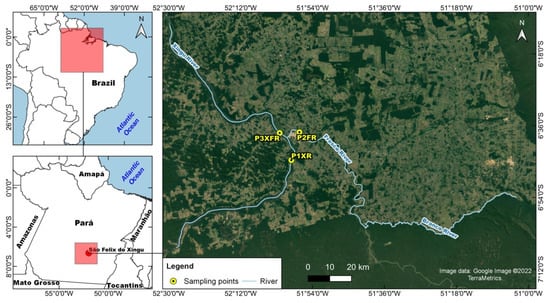 The Xingu River is one of the largest tributaries of the Amazon River, originating in Mato Grosso state and crossing the state of Pará. It has a length of 1640 km, draining 510,000 km2 in one of the most protected regions on the planet, composed of a mosaic of preserved areas. There are approximately 20 indigenous lands and conservation units, forming a corridor of 280,000 km2 [,]. Knowledge about the biodiversity of the Xingu River is still limited, although studies have highlighted its great potential for the region []. According to Jézéquel et al. [], it is estimated that approximately 821 species of fish inhabit the basin, 73 of them being endemic. However, this diversity is exposed to the constant impacts of different land uses in the region [].
