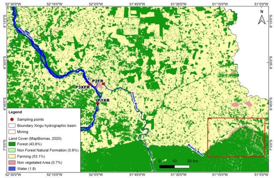 The mapping of land cover and use was performed using the MapBiomas Collection 6 plug-in for the QGIS geographic information system (GIS) software package. MapBiomas maps are produced from pixel-by-pixel classification of Landsat satellite images, with spatial resolution of 30 m. Collection 6 of the MapBiomas Project (http://mapbiomas.org) (accessed on 31 January 2022), released in August 2021, covers the period from 1985 to 2020 []. In QGIS, the vectorization of the banks of the Xingu and Fresco Rivers was carried out for the water class of the MapBiomas map in each study section. From the vectorization of the edges, a distance map (buffer) of 120 m was calculated for both edges to quantify the classes of land cover and use []. Land use and vegetation cover on the banks of the Xingu and Fresco Rivers were represented by four classes: forest, non-forest natural formations, agriculture and livestock, and non-vegetated areas.