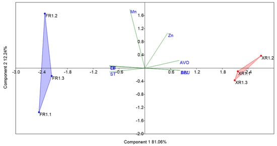 PCA components plot (based on the correlation matrix) for the waters of the Xingu River (XR) and the Fresco River (FR), considering the following variables: Mn, Zn, avoidance (AVO), total solids (TS), turbidity (TB), area with forest (FOR), aquatic invertebrate abundance (ABU), and aquatic invertebrate diversity (DIV).
