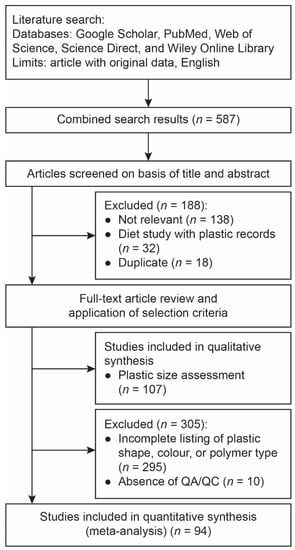 The publications were reviewed based on the following criteria (Figure 1). Firstly, the titles and abstracts of the articles were screened to search for related studies. Studies on fish exposure to plastics in a laboratory setting were excluded. In the second step, the materials and methods section of each article was examined to ensure that the numbers of plastic shape, colour, and polymer type were reported. If the data were not reported in numbers, they were extracted from published diagrams using WebPlotDigitizer Version 4.5 (Ankit Rohatgi, Pacifica, CA, USA). Studies that assigned plastic size class and predominant size class were included for qualitative analysis. Due to the importance of contamination control in plastic research during the extraction process, the studies were checked for quality assessment/quality control (QA/QC). Studies that did not include any QA/QC were excluded from meta-analysis of plastic characterisation.