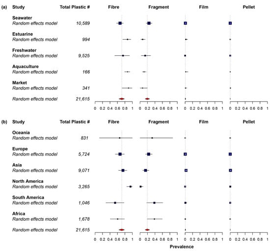 Prevalence forest plot for plastic shape. Blue squares represent subgroup means, while red diamonds and the dotted line represent the overall mean. (a) Subgroup of sampling environment. (b) Subgroup of sampling continent. For statistical details, see individual forest plots in supplementary information (Figures S4–S7).