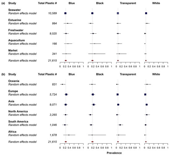 Prevalence forest plot for plastic colour. Blue squares represent subgroup means, while red diamonds and the dotted line represent the overall mean. (a) Subgroup of sampling environment. (b) Subgroup of sampling continent. For statistical details, see individual forest plots in supplementary information (Figures S8–S11).