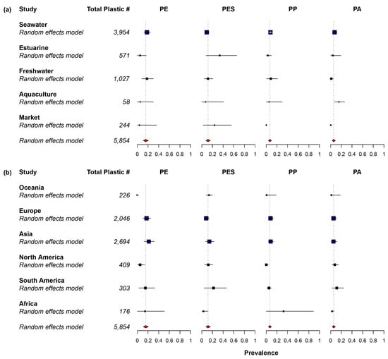 Prevalence forest plot for plastic polymer type. Blue squares represent subgroup means, while red diamonds and the dotted line represent the overall mean. (a) Subgroup of sampling environment. (b) Subgroup of sampling continent. PE: Polyethylene; PP: Polypropylene; PES: Polyester; PA: Polyamide. For statistical details, see individual forest plots in supplementary information (Figures S12–S15).