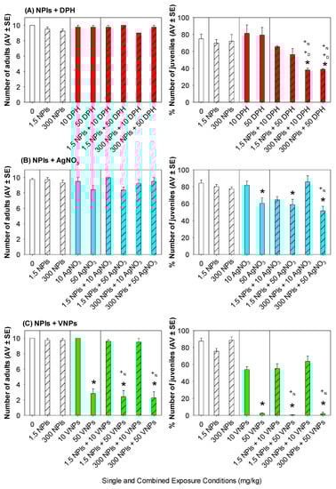 The soil was dried (48 h; 60 °C) before use. The control soil was prepared by adding deionized water to adjust to the adequate moisture content (50% of the maximum WHC). Due to the presence of 2% of triton X-100 on the VNPs stock dispersion, a solvent control was also performed, adding the same volume of triton X-100 present in the highest tested concentration of VNPs (50 mg/Kg) (corresponding to 0.2% of triton X-100). For DPH and AgNO3 test solutions, they were dissolved in ultrapure water, no organic solvent needed. The required volumes of NPls test dispersions prepared in ultrapure water—single and combined with DPH, AgNO3 or VNPs—were added to the pre-moistened soil (in which water was added before) until 50% of the WHC maximum and mixed manually. Moreover, for the single exposures, test solutions of DPH and AgNO3 and test dispersions of VNPs, prepared in ultrapure water, were added to the soil, as described for NPls test dispersions. The replicates were mixed individually as recommended by the Organisation for Economic Cooperation and Development (OECD) guidelines []. Soil spiking was performed according to the following experimental conditions: single exposures of NPls (1.5 and 300 mg/kg) and DPH, AgNO3 and VNPs (10 and 50 mg/kg), as well as the binary mixtures of NPls with each co-contaminant (1.5 mg NPls/kg + 10 mg DPH/kg; 1.5 mg NPls/kg + 50 mg DPH/kg; 300 mg NPls/kg + 10 mg DPH/kg; 300 mg NPls/kg + 50 mg DPH/kg; 1.5 mg NPls/kg + 10 mg AgNO3/kg; 1.5 mg NPls/kg + 50 mg AgNO3/kg; 300 mg NPls/kg + 10 mg AgNO3/kg; 300 mg NPls/kg + 50 mg AgNO3/kg; 1.5 mg NPls/kg + 10 mg VNPs/kg; 1.5 mg NPls/kg + 50 mg VNPs/kg; 300 mg NPls/kg + 10 mg VNPs/kg; 300 mg NPls/kg + 50 mg VNPs/kg). The selected single VNPs, AgNO3 and NPls concentrations, the toxicities of which were previously studied [,,], were used to examine the role of NPls in the toxicity of those contaminants. For DPH concentrations, its effects on E. crypticus were not known yet (single and combined with NPls). All the ecotoxicity tests started 1 day after soil spiking, similar to other previous published studies involving the testing of nano-based materials [,,,,].