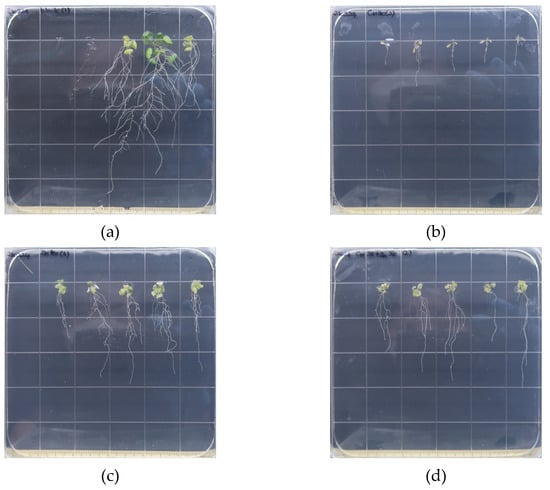 At the end of the experiment, the Petri dish was photographed with a high-resolution camera (Canon G7X Mark II, Tokyo, Japan), and the above-ground part was harvested, weighed, and extracted with 5.0 mL of 80 percent acetone to measure chlorophyll-a (Chl-a), chlorophyll-b (Chl-b), and carotenoid concentrations []. ImageJ software was used to convert the photos to an 8-bit RGB format, which was then used by SmartRoot software to assess the total root length (TRL) [,].