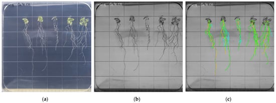 Image processing procedures for the estimation of the total root length of A. thaliana cultured in a growth chamber for 8 days on an agar medium: (a) original high resolution; (b) image conversion to 8-bit RGB format by ImageJ; (c) SmartRoot semi-automatic root length estimation. The primary root (yellow), secondary (green), and tertiary (blue) roots are all color-coded.