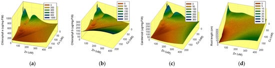 The TRL in Figure 4d showed more consistent and continuous results than pigment concentrations. It decreased along the x-and y-axes, and a concave zone appeared in the central region, indicating that two HMs have synergistic toxic effects on TRL. Previous studies found that at 300 μM, A. thaliana shoot and root growth were significantly slowed, and chlorosis was caused by Fe absorption inhibition caused by excess Zn [,]. In hydroponic culture, root development of A. thaliana was reduced starting at Cu 25 μM and entirely stopped at Cu 50 μM due to root meristem damage []. The main and lateral root length development were the most effective indicators of HM toxicity to A. thaliana grown on a Petri dish []. For these reasons, EC50 is estimated based on TRL.