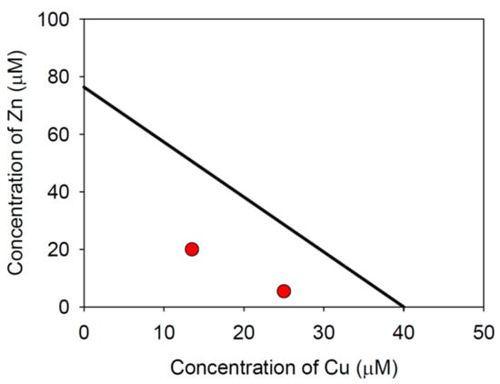 The estimated EC50 isobole of Cu and Zn in comparison to two red dots showing synergistic toxic effects. The straight line of isobole is constructed using the EC50 values of Zn and Cu estimated from the results of single heavy metal experiments. Equation (4) was used to obtain two red dots from the results of a combination of two HM experiments.