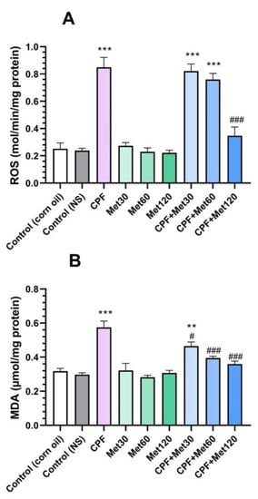Results of oxidative stress biomarker tests on the brain tissue of 6 Wistar rats in each group. Data were obtained from 4 repeated measurements and are reported as the mean ± SEM. (A) Reactive oxygen species (ROS) assay. (B) Malondialdehyde (MDA) assay.** p-value < 0.005, *** p-value < 0.001; compared with the control groups. # p-value < 0.05 and ### p-value < 0.001; compared with chlorpyrifos (CPF) group.