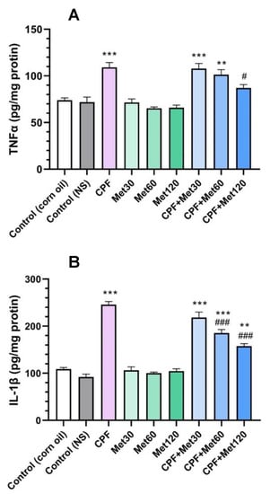 First, 0.1 g samples of the cortex of the brain tissue were homogenized with 1 mL of phosphate buffer and centrifuged for 15 min at 3000× g. The supernatant of the samples was collected for measuring inflammatory cytokines. Measurement of inflammatory biomarkers, including TNFα and IL-1β, was performed using rat-specific ELISA kits, according to the kit manufacturer’s protocol [].