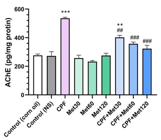 The results of AChE inhibition are explored in Figure 3. Results demonstrated that the administration of CPF in the animals significantly increased AChE inhibition in the brain tissue compared to the control groups (p-value < 0.001), which demonstrates the accumulation of ACh in the synaptic cleft, which can over-stimulate the relevant receptors, resulting in neurotoxicity. However, in the groups receiving 30 mg/kg, 60 mg/kg, and 120 mg/kg of metformin, the inhibition of AChE did not show any changes compared to the control groups, which confirms metformin’s safety profile in AChE inhibition. Results also demonstrated that metformin has modulatory potential to prevent the inhibition of AChE. These results also showed significant reductions in AChE inhibition in the CPF + Met-30, CPF + Met-60, and CPF + Met-120 groups (p-value < 0.005, p-value < 0.001, and p-value < 0.001, respectively). Moreover, the CPF + Met-60 and CPF + Met-120 groups did not show significant differences compared to the control groups, indicating the concentration-dependent modulatory impacts of metformin.
