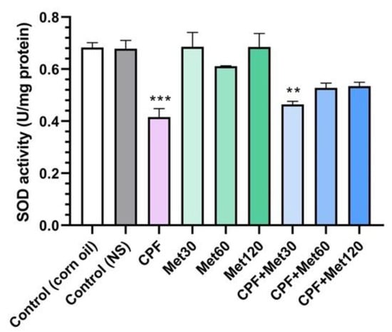 According to the results obtained from the SOD activity test, the treatment of Wistar rats with CPF significantly reduced SOD activity compared to the control groups (p-value < 0.001). Although metformin showed neutral impacts on SOD activity and the groups receiving metformin at 30 mg/kg, 60 mg/kg, and 120 mg/kg concentrations did not show changes in the level of SOD activity, metformin could improve SOD activity when administrated with CPF. The concentration-dependent modulatory effect of metformin has been demonstrated in Figure 4. Elevated activity of SOD in the CPF + Met-30, CPF + Met-60, and CPF + Met-120 groups showed that although the SOD activity of CPF + Met-30 had a significant difference from that of the control groups (0.005), the lack of significant differences in the SOD activity of the CPF + Met-60 and CPF + Met-120 groups confirmed the beneficial role of metformin in the neurotoxicity induced by CPF.