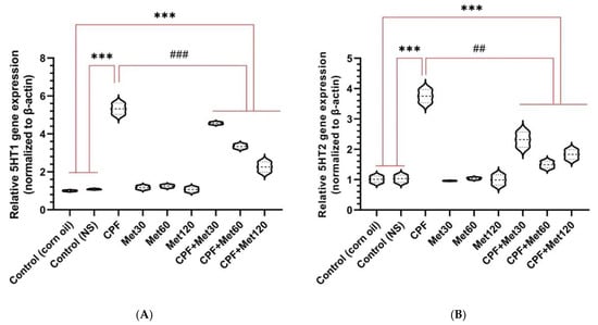 Expression of the genes associated with serotonin receptors (5HT1 and 5HT2, in (A,B), respectively) in the brain tissue of 6 Wistar rats in each group. Data were obtained from 4 repeated measurements and are reported as mean ± SEM. *** p-value < 0.001; compared with the control groups. ## p-value < 0.005 and ### p-value < 0.001; compared with chlorpyrifos (CPF) group.