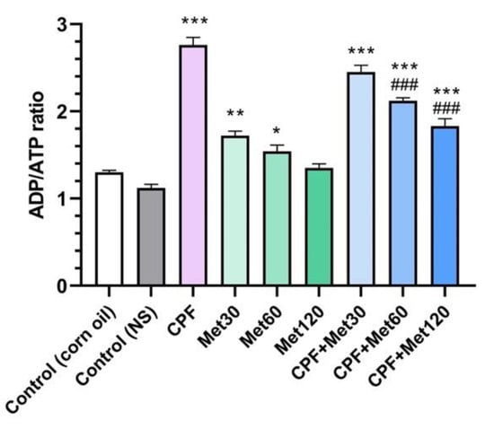 The ADP/ATP ratio test results showed a significant increase in the ADP/ATP ratio in the group treated with CPF compared to the control group (p-value < 0.001). Moreover, the administration of lower metformin concentrations increased the ADP/ATP ratio in the brain tissue. In other words, although a significant difference was not observed in the Met-120 and control groups, the Met-30 and Met-60 groups showed an increased ADP/ATP ratio, with p-values of <0.005 and <0.05, respectively, which is associated with the AMP-dependent mechanism of metformin. Moreover, this concentration-dependent impact of metformin was observed in the groups exposed to CPF and metformin. These groups, including CPF + Met-30, CPF + Met-60, and CPF + Met-120, showed a significant increase in the ADP/ATP ratio compared to the control groups (p-value < 0.001 for all of the groups). However, in the CPF + Met-60 and CPF + Met-120 groups, the ADP/ATP ratio was significantly lower than in the CPF group (p-value < 0.001 for both groups). Nonetheless, the ADP/ATP ratio test results in the CPF + Met-120 group showed the lowest ratio among other groups receiving metformin and CPF simultaneously. Figure 6 demonstrates the results obtained from the ADP/ATP ratio test.