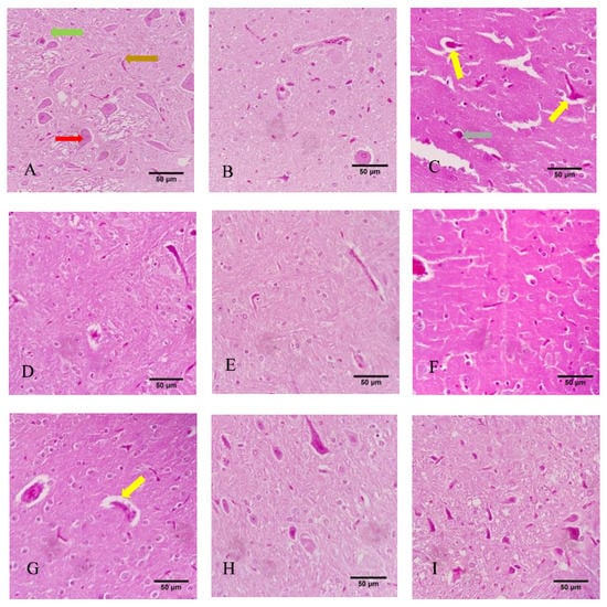 Histological sections of the cortex of the brain tissue of 6 Wistar rats in each group. Yellow, gray, green, red, and brown arrows indicate vacuolization, pyknosis, glial cells, perikaryon, and projections. (A) Control (corn oil), (B) Control (NS), (C) CPF, (D) Met-30, (E) Met-60, (F) Met-120, (G) CPF + Met-30, (H) CPF + Met-60, (I) CPF + Met-120.