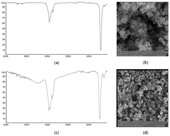 Characterization of the sorbents. FT-IR spectra, (a) copolymer (2) and (c) modified copolymer (3). Scanning electron micrographs at 2 μm, (b) copolymer (2), and (d) modified copolymer (3).