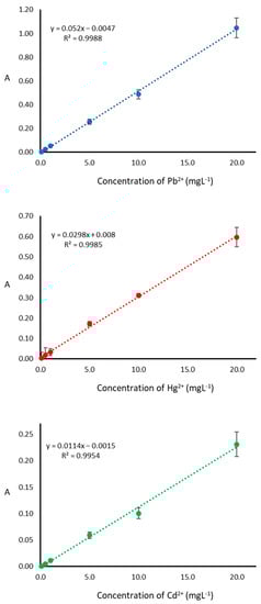 Quantification was performed by UV-Vis spectrophotometry, an economical technique compared to techniques involving mass spectrometry. However, despite having a detection system with limited sensitivity (UV), it was possible to reach ppb levels (µgL−1) as in other similar studies []. Figure 2 shows the calibration curves for the detection of each metal in the range from 0.1 to 20.0 mgL−1. The method showed optimal linearity (R2 > 0.99).