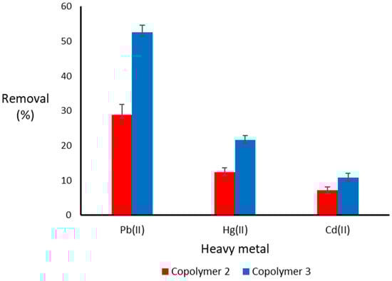 First, a preliminary experiment was carried out to establish if the impregnated copolymer showed better results (%) in removing heavy metals compared to the unimpregnated copolymer. The removal protocol was applied, using 20 mg of each copolymer and doping 20 mL of pure water at 20 mgL−1 for 60 min at pH 5. Figure 3 shows that impregnated copolymer (3) exhibited the highest removal. Therefore, subsequent removal tests were performed using impregnated copolymer (3).