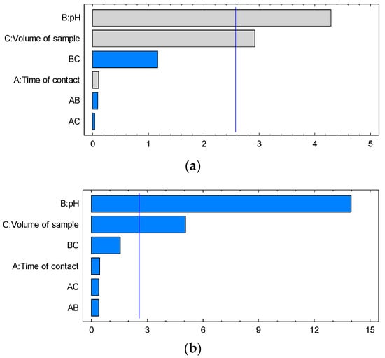 The standardized Pareto charts show that only pH and volume of sample influenced the response (removal) for all the heavy metals studied (Figure 4).