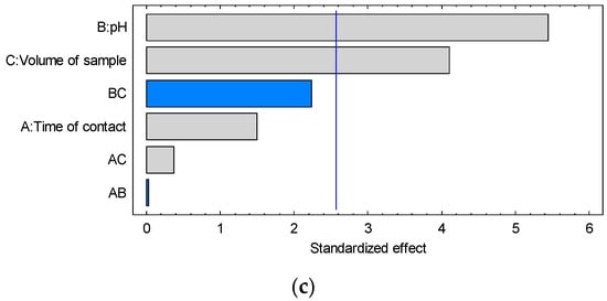 Standardized Pareto charts of the experimental design of the screening using impregnated copolymer (3). (a) Pb2+, (b) Hg2+, (c) Cd2+.