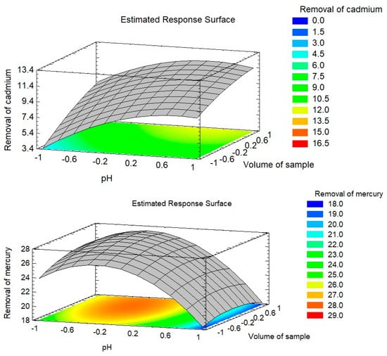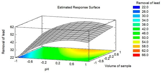 Finally, the optimal conditions for maximum removal values (~20–70%) were obtained with the response surface graphs, which show the combination of factorial levels (Figure 5).