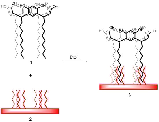 The modification of polymeric materials with organic ligands can be performed by physical adsorption or by chemical reaction with a functional group of the polymer. There are several types of molecules that can be used to modify the surface of polymers, for example, the use of macrocyclic ligands such as crown ethers, cyclodextrins, calix[4]arenes, and calix[4]resorcinarenes. It is interesting to note that the use of calix[4]resorcinarenes as macrocyclic molecules for ion or molecule recognition can contribute significantly in this field of toxic metals removal. Calix[4]resorcinarenes, commonly known as resorcinarenes, are obtained from the condensation reaction of resorcinol with different aldehydes in acid solutions [,], and they can be modified with various substituents on their upper rim in order to provide specific functionality and selectivity [,,]. Calix[4]resorcinarenes have been widely used in numerous applications, such as sensors [,], catalysis [], dendrimer synthesis [,], dyeing of fibers [,], NMR solvating agents [,], heavy metal complexes for water purification [,], and chemical separations by modification of multiple surface types [,].