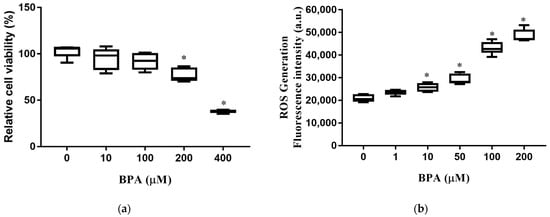 BPA-induced cytotoxicity and ROS production: (a) Cells were incubated at different concentrations of BPA for 24 h. Cell viability was measured using an MTT assay; (b) cells were pretreated with 2′, 7′-dichlorofluorescin diacetate for 45 min and loaded with BPA for 6 h. Intracellular ROS levels were determined according to fluorescence intensity. The boxplots present the median (central horizontal line), 25th and 75th quartiles (upper and lower limits of the box), and the maximum and minimum range values (error bars). The results are expressed as the mean ± SD of six independent experiments. * p < 0.05 vs. control (without BPA) group.