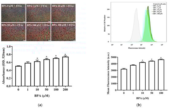 Carchia et al. reported that BPA exposure caused a time-dependent decrease in mitochondrial membrane potential and increased cellular ROS levels, leading to the induction of cell apoptosis []. In this study, BPA exposure dramatically decreased cell viability (Figure 1a) and increased ROS generation in HUH-7 cells (Figure 1b). Free fatty acids are major mediators of hepatic lipid deposition. Free fatty acid uptake and lipid accumulation in hepatocytes were significantly increased after BPA exposure (Figure 2a,b), which suggests that BPA exposure may contribute to NAFLD progression through BPA-mediated free fatty acid uptake and lipid accumulation.