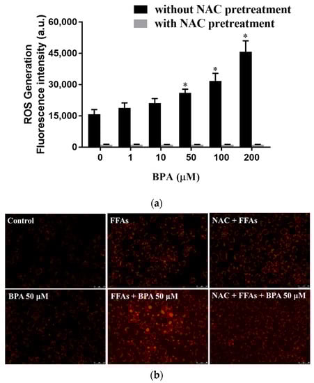 A previous study reported that HepG2 cells and primary hepatocytes treated with the ROS inducer H2O2 showed higher levels of lipid accumulation compared to untreated cells []. However, it is still unclear whether BPA exposure can promote the progression of NAFLD by increasing ROS-induced fatty acid uptake. The present study aimed to investigate whether BPA coupled with a HFCCD promotes the development of fatty liver by enhancing ROS production and lipid accumulation in hepatocytes.