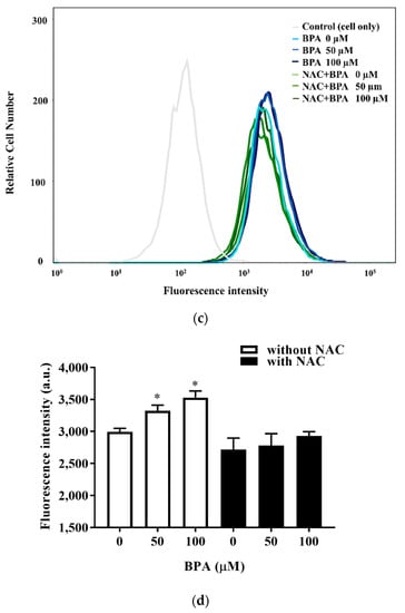 We blocked intracellular free radical production with NAC to evaluate the role of ROS in the BPA-induced uptake and intracellular accumulation of lipid droplets. NAC prevented BPA-induced ROS production (Figure 3a) and, consequently, reduced BPA-induced lipid accumulation (Figure 3b). The effect of BPA exposure on intracellular fatty acid uptake was confirmed with flow cytometry using fluorescence-labeled lipids (Figure 3c,d).