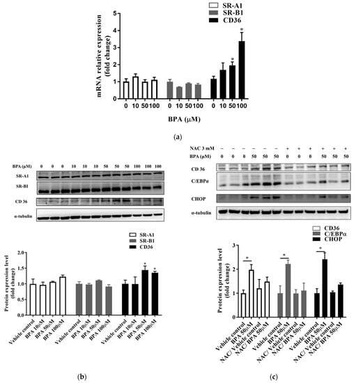 NAC inhibited the C/EBPα and CD36 lipid-related endocytosis pathway, which was upregulated by BPA exposure. Cells were treated with the indicated concentrations of BPA for 24 h. The (a) mRNA and (b) protein expression levels of CD36, SR-A1, and SR-B1 were assessed using RT-qPCR and immunoblotting, respectively. (c) To determine whether BPA exposure increases CD36 expression by increasing ROS production, cells were pretreated with or without NAC (3 mM) for 1 h. The protein expression levels of CD36, C/EBPα, and CHOP were determined using immunoblotting. Protein expression levels were normalized to α-tubulin. Data are shown as the mean ± SD of three independent experiments. * p < 0.05 vs. vehicle control group.