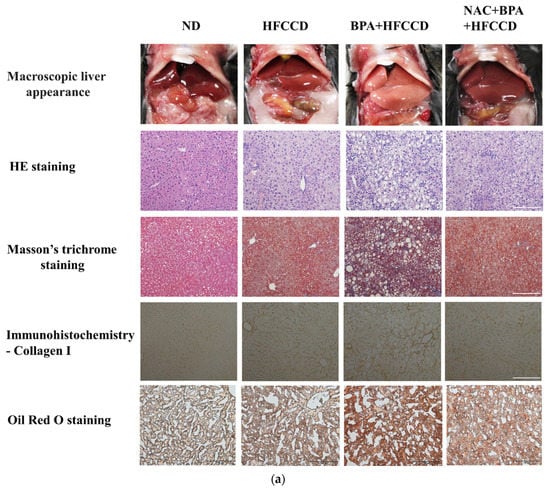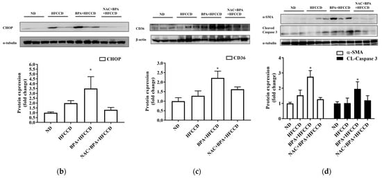 We combined a HFCCD with BPA in the present study to simulate a high-fat human diet coupled with environmental toxicant exposure. A more serious stage than NAFLD called nonalcoholic steatohepatitis (NASH) can cause severe liver damage and liver failure, leading to rapid body-weight loss []. In this study, we observed a relative increase in liver and spleen weight, but a significant decrease in the body weight of the mice fed BPA+HFCCD for 8 weeks. A high-fat/high-cholesterol diet has been reported to increase liver weight, as well as fat infiltration, triglycerides, and total cholesterol in the liver, compared with an ND and HFD diet []. Furthermore, it also has been indicated that administration of a methionine-choline-deficient (MCD) diet to mice induces a rapid and severe steatohepatitis state. Compared to the mice fed the control diet for the same duration, mice lost body weight after receiving the MCD diet []. We found that the markers of hepatosteatosis (Masson’s trichrome staining), as well as collagen I expression (IHC staining), were higher in the BPA + HFCCD group compared with the other groups (Figure 5a). The protein expression of cleaved caspase 3 was also higher in the BPA + HFCCD group, which implies that exposure to BPA and a high-fat diet may increase the progression of NAFLD and, eventually, lead to liver fibrosis. NAC downregulated the protein expression of CHOP, CD36 (Figure 3b,c), and cleaved caspase 3 (Figure 5d). These results suggest that BPA exposure coupled with a HFCCD induces hepatosteatosis through ROS-induced CD36 overexpression, as well as hepatic lipid accumulation.