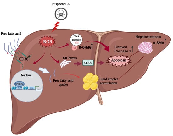 To summarize: BPA exposure in a high-fat-diet model increased intracellular ROS production which, in turn, induced C/EBPα and CD36 overexpression to promote intracellular free fatty acid uptake, liver damage, and caspase-3 activation for apoptosis; increased α-SMA expression for steatohepatitis; and accelerated the fibrotic process (Figure 6). However, the detailed mechanism by which BPA induces ROS production to increase CD36 expression and free fatty acid accumulation requires further research.