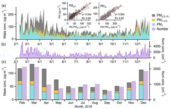 The daily and monthly variations of PM mass and number concentrations over the studied period are presented in Figure 1. The mass concentrations were, on average, 77 ± 61 μg m−3 (mean ± 1σ standard deviation) for PM10, 45 ± 30 μg m−3 for PM2.5, and 35 ± 26 μg m−3 for PM1 across the year. Here, PM10, PM2.5, and PM1 correspond to the PM with aerodynamic diameters less than 10, 2.5, and 1 µm, respectively. These values are much higher compared to the annual air quality limit standards for PM2.5 and PM10 (5 and 15 μg m−3, respectively) published by the World Health Organization (2021). In general, the PM mass concentrations were substantially higher in the spring and winter seasons compared to those in the summer and fall seasons. The total mass concentrations were significantly composed by those of coarse particles PM2.5–10 during springtime, whereas it was dominated by fine particles of PM2.5 during wintertime. The mass concentrations of PM2.5 and PM10 measured by the EDM-180 particle monitor in this study correlated strongly overall with those from the national air quality monitoring station (r of 0.90 and 0.92, respectively) (the small panels in Figure 1a). Nevertheless, the former were slightly lower compared to the latter. This was possibly due to the uncertainties associated with the different principles of monitoring devices; that is, a tapered element oscillating micro-balance was used at the national air quality monitoring station.