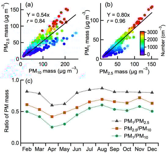 Correlations of the mass concentration of (a) PM2.5 vs. PM10 and (b) PM1 vs. PM2.5 over the studied period, and (c) the monthly averages of the mass concentration ratios of PM1/PM2.5, PM2.5/PM10, and PM1/PM10.