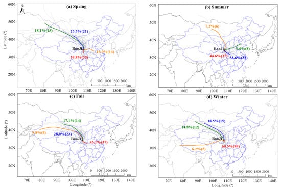 The daily backward trajectories of air masses and the cluster analysis in the four seasons of spring (March–May), summer (June–August), fall (September–November), and winter (December–February) of 2018 in Baoji city. The duration of each trajectory was 72 h. The solid colored lines represent air masses with different origins based on the cluster analysis. The values represent the percentage and the number of air mass trajectories with different origins.