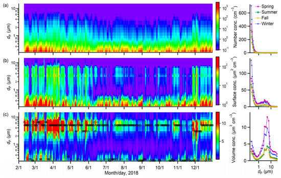Size-resolved (a) number, (b) surface area, and (c) volume concentrations of PM over the studied period and their seasonally averaged size distributions. Results presented in the image plots were averaged for daily data. The black circles in (c) represent the mode diameters of PM volume concentrations.