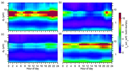 Diurnal profiles of the size-resolved PM volume concentrations for individual seasons: (a) spring, (b) summer, (c) fall, and (d) winter.