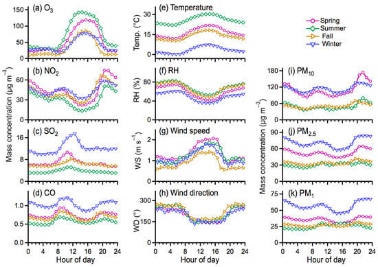 Diurnal profiles of (a–d) the precursor gaseous pollutants of O3, NO2, SO2, and CO and (e–h) the meteorological parameters of temperature, relative humidity, wind speed, and wind direction, and (i–k) the mass concentrations of PM10, PM2.5, and PM1 for spring, summer, fall, and winter seasons.