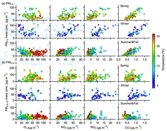 Correlations of the mass concentrations of (a) PM2.5 and (b) PM2.5–10 versus gaseous pollutants (O3, NO2, SO2, and CO). The markers were colored by the air temperature. Results presented here were averaged for daily data.
