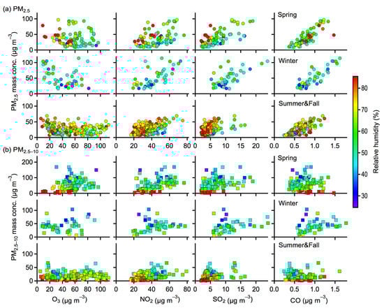 Correlations of the mass concentrations of (a) PM2.5 and (b) PM2.5–10 versus gaseous pollutants (O3, NO2, SO2, and CO). The markers were colored by the relative humidity in the air. Results presented here were averaged for daily data.