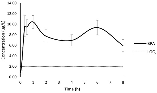Time course of plasma bisphenol A (BPA) concentration with confidence interval at 95% as error bars and limit quantification (LOQ).