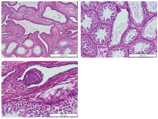A histopathological examination of 4 μm-thick tissue sections of formalin-fixed paraffin-embedded (FFPE) samples of testes and epididymides stained with H&E and PAS-H was performed by light microscopy. The examined slides were blinded with regards to the treatment groups. Testes were evaluated in a “stage-aware” manner [,,]. We based the evaluation of the testes and epididymides on the published recommendations of Lanning et al. [] and Creasy et al. []. The endpoints examined in the testes of rams in our study were perivasculitis, Sertoli-only tubules, segmental hypoplasia, vacuolation of Sertoli cells, multinucleated cells, mononuclear infiltrates, sperm retention, sperm head phagocytosis in the basal Sertoli cell cytoplasm, and sperm granuloma, as well as Leydig cells atrophy, Leydig cells hypertrophy/hyperplasia, and Leydig cells vacuolation. In the rete testis, we examined the following endpoints: mononuclear infiltrates, multinucleated cells, mineralization, and fibrosis. The endpoint examined in the epididymis were mononuclear infiltrates, pyknotic sperm, sloughed epithelial cells and sperm granuloma.