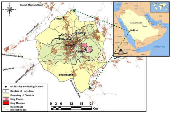 Hourly measured data of several air pollutants and meteorological variables for years 2019 and 2020 were collected at five air quality monitoring stations in Makkah, Saudi Arabia (Figure 2). The air quality monitoring stations were: Aziziah, Otibiah, Shawqiah, Haram, and Umrah. The Aziziah site (21.40377, 39.87837) is close to the Holy Mosque and is considered an urban traffic site. Aziziah district is famous for its busy roads and the presence of many commercial centres including many shopping malls and restaurants. The Shawqiah site (21.36589, 39.80747) is located in the southern part of Makkah city and surrounded by an intensive residential complex. Shawqiah district is considered one of the main residential districts of Makkah, belonging to the municipality of Al-Shawqiah. Otibiah station (21.44222, 39.81189) experiences highly commercial activities due to its closeness to the centre of Makkah city. Haram station (21.42464, 39.82917) is located in the eastern yard of the Grand Holy Mosque (Figure 2) and can be considered an urban background site. Finally, Umrah station (21.50847, 39.79339) is located on the north-western side of Makkah city. Umrah district is the industrial city of Makkah. Umrah district has the main electrical power station of Makkah, which is responsible for fulfilling the electrical and power need of the city of Makkah.