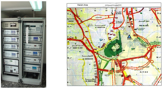 Map showing the location of monitoring sites in Makkah: Umrah, Otibiah, Aziziah, Shawqiah, and Haram. No data were available from Shara’a for 2020; therefore, comparison was not made for this site. The lower panel shows the location of the Haram site inside the Holy Mosque and the equipment (Environment SA) used for collecting the data.