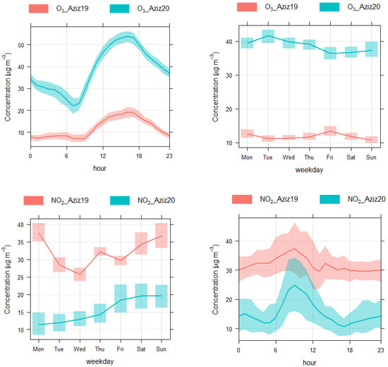 To calculate whether the concentrations of NO2, O3, and PM10 decreased or increased during the COVID-19 lockdown, the levels of these pollutants in 2019 were deducted from those in 2020; therefore, reductions in pollutant levels are shown by negative numbers, whereas increases are shown by positive numbers (Table 1). Both absolute and percent changes in pollutant levels were calculated. As an example, diurnal and weekly cycles of O3 and NO2 concentrations at the Aziziah site are depicted Figure 3, which clearly show a reduction in NO2 and an increase in O3 concentrations. However, the changes in concentrations varied from day to day and hour to hour. According to the results presented in Table 1, PM10 concentrations had decreased at the Aziziah, Otibiah, Shawqiah, and Umrah sites, whereas the levels had slightly increased at the Haram site. In the case of NO2, the concentrations decreased at the Aziziah, Otibiah, Umrah, and Haram sites, whereas due to missing data changes, those at the Shawqiah site were not calculated. In contrast, the levels of O3 increased at all sites, except at the Umrah site. When the levels were averaged for all sites, the levels of PM10 decreased by 12%, the levels of NO2 decreased by 58.66%, and the levels of O3 increased by 68.67%.