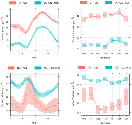 After the model validation, the models were refitted using pollutant and meteorological data along with temporal parameters for the year 2019. The trained models were reused to predict the pollutant concentrations for the BAU scenario. The concentrations predicted by the models were subtracted from the observed concentrations during the COVID-19 lockdown period. Positive difference (observed–predicted = positive difference) meant that the concentration was higher than what the model predicted; therefore, it meant the concentrations had increased during the lockdown period. In contrast, if the difference was negative between the observed and the predicted concentrations, that meant the concentration had decreased during the lockdown period. Table 3 shows the detailed results of the machine learning analysis of the three pollutants at all five monitoring sites. As an example, Figure 4 shows weekly and diurnal cycles of predicted and measured concentrations at Aziziah site. According to the model outputs, mean levels of O3 concentration increased by 42.45%, whereas the levels of NO2 and PM10 decreased by 12.30% and 10.75%, respectively. At the Otibiah site, the level of O3 increased by 19.69%, while the levels of NO2 and PM10 decreased by 4.08% and 7.90%, respectively. At the Shawqiah site, the level of O3 increased by 11.69%, the level of PM10 decreased by 6.01%, and the changes in NO2 were not calculated due to missing data. At the Umrah site, the levels of O3, NO2, and PM10 decreased by 13.93%, 35.79%, and 13.99%, respectively. Finally, at the Haram site, the level of O3 increased by 49.92%, while the levels of NO2 and PM10 decreased by 14.81% and 9.67%, respectively. When changes in the levels of pollutants were averaged at all five sites, it showed that overall O3 levels had increased by 21.96%, the levels of NO2 had decreased by 13.40%, and the levels of PM10 had decreased by 9.66%. Comparing these results with the previous section, it could be observed that the comparison of measured concentrations in 2019 with 2020 showed higher changes than those predicted by the machine learning technique. The model predictions actually removed the effect of meteorology, which affected the levels of pollutants. Hence, weather-corrected changes were moderate as compared to the changes in raw data, which is in agreement with Munir et al. [10] and Jephcote et al. [28].