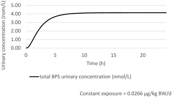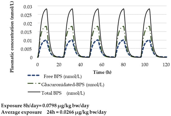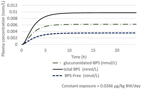 Karrer et al. (2018) extended to BPS the PBPK model developed by Yang et al. in 2015, used previously by EFSA in 2015 for calculating the Human Equivalent Dose Factor (HEDF) (ratio of AUC Animal/AUC Human) and deriving the t-TDI for BPA [,,]. To validate the model, a comparison of predicted concentrations with measured concentrations of BPS and total BPS (BPS-G + free BPS) in two volunteer studies [,,] has been performed. The blood flow was replaced by a plasmatic flow (BPS being mostly distributed in the plasma) and a value for the haematocrit of 0.45 was used. Outputs of excreted urinary BPS quantities were also replaced with urinary BPS concentrations by adding an estimated value for the daily 24 h urinary excretion. The same daily urinary excretion rate of 0.05 L/h previously used for BPA was considered. After oral administration, an absorption fraction of 100% was considered.