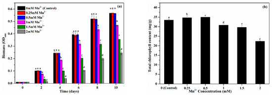 Effect of Mn2+ on (a) the mixed MnOMs growth, and (b) the total chlorophyll content after 10 days of cultivation. The different letters above the error bars showed significant differences between control and treatment (p < 0.05).
